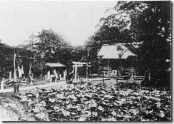 浮世絵の社殿近くに聳えている樟が「連理の樟」で、一つの根から二つの幹を見せる姿で有名でした。残念ながら大正年間には枯れてしまい、現在は二つの幹を見ることはできません。どちらかの幹だけ残ったものなのか、別のものなのか確認できていませんが、大きな樟だけは残っています。